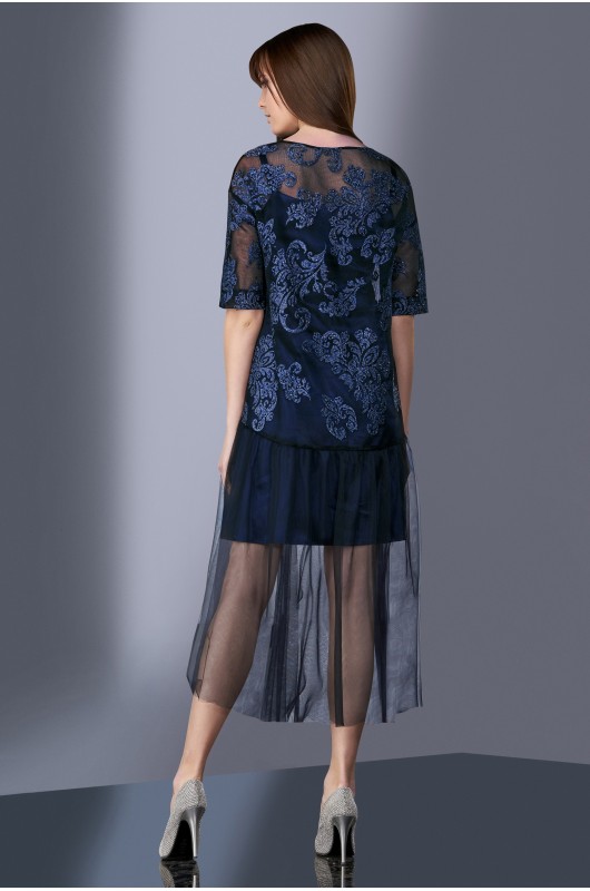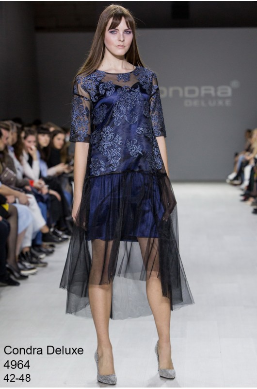 Сетка, фатин отражают тенденции сезона - комфорт в одежде. Эта модель «А» силуэта, многоярусная. Верхний слой словно окружает основное платье легкой дымкой. Лиф выполнен из сетки с роскошной вышивкой. Волан по низу платья, придает легкость и воздушность образу. Прозрачность фактуры подчеркивает сатиновое нижнее платье, в унисон вышивке. Свободный силуэт, несимметричный низ, заниженная линия талии, длина изделия, все в данной модели выдержанно в тенденции этого сезона. От этого платья просто невозможно отвести глаз.